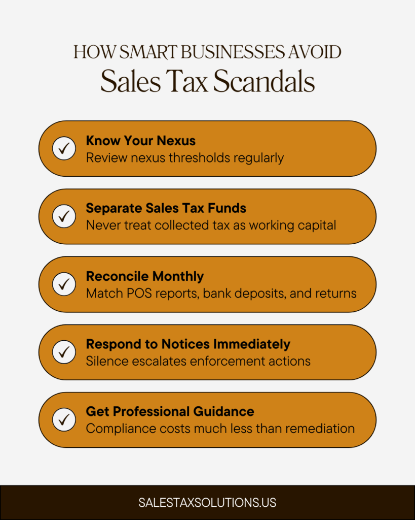 All of the stories we have covered involve intentional sales tax evasion. While most business owners don’t set out to commit fraud, compliance gaps, ignored notices, and poor controls can snowball quickly.