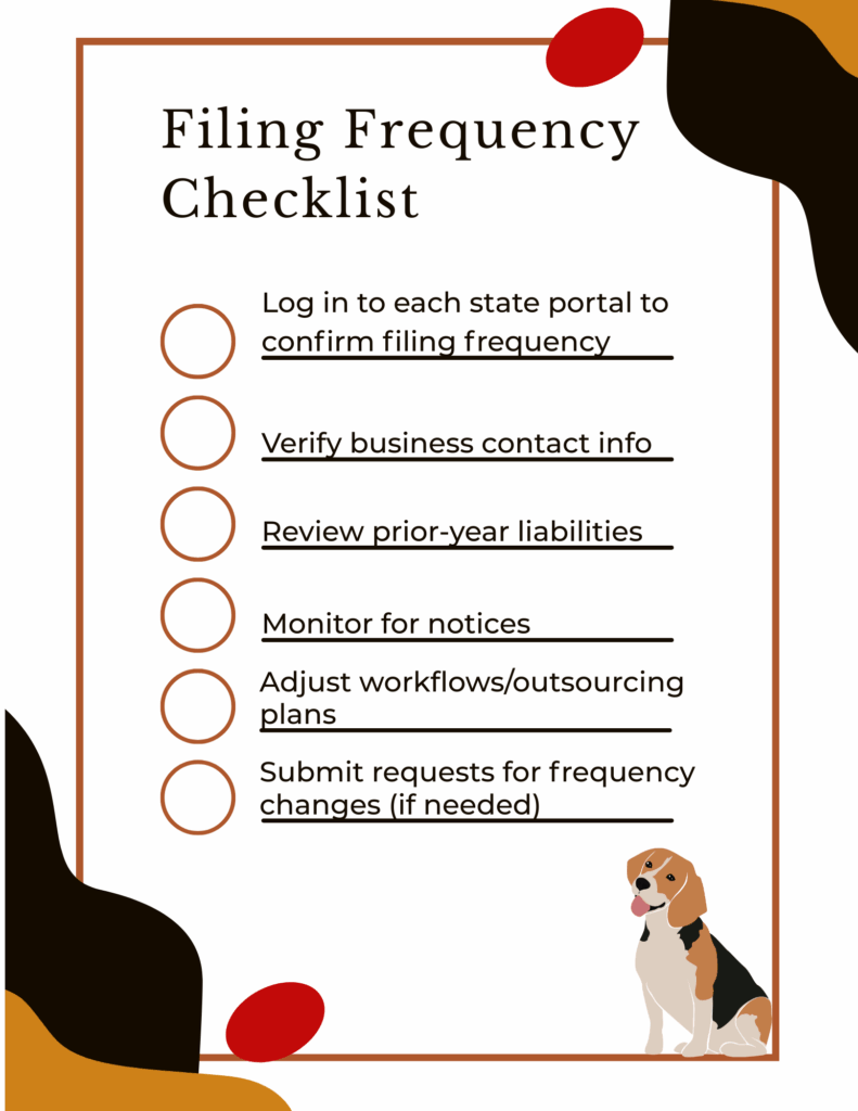 Use this checklist every November-December and again every May-June to stay ahead of filing frequency changes!